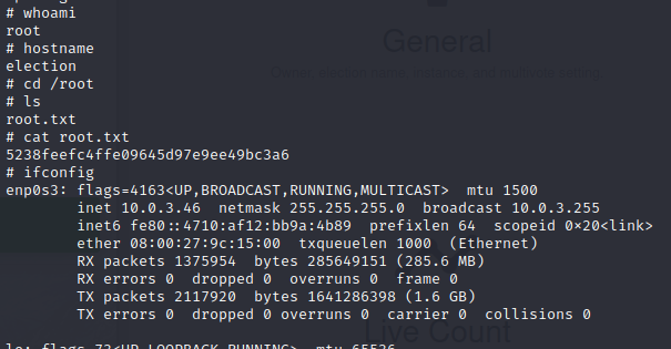 + http://10.0.3.46/server-status (CODE:403|SIZE:274)—- Entering directory: http://10.0.3.46/election/ —-