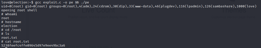 In love’s SSH session, copy/pasted the exploit code into a file named exploit.c, compiled the code, and ran the exploit