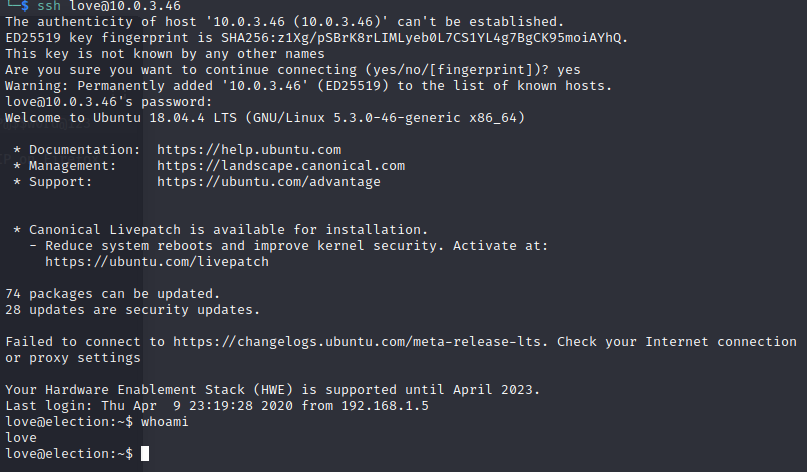 Used the love:P@$$w0rd@123 credentials to start an SSH session as love on the target machine