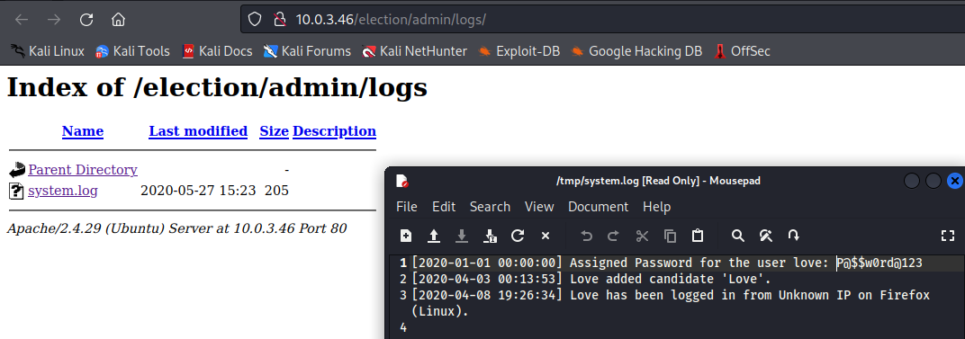 The logs folder has a file named “system.log” which, upon inspection, contains credentials for a user named “love”